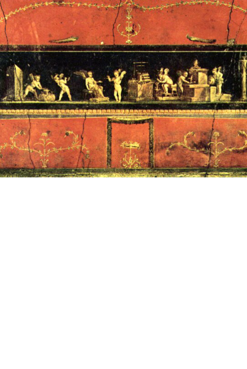 A section of the 1st century CE cupids frieze from the triclinium or dining room from the House of the Vetti. The frieze depicts cupids selling flowers and perfumes and as workers who sell flowers, make wine and work gold.
