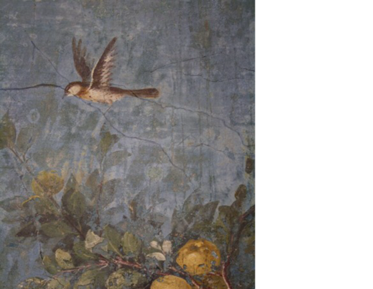 A detail of the garden fresco from the winter triclinium (dining room) from the Villa of Livia, wife of Augustus, Rome. The life-size representations of trees, flowers, fruit and birds decorate all four walls of the room to create a continuous and 360° view of a garden which adds perspective by increasing clarity in the foreground subjects.