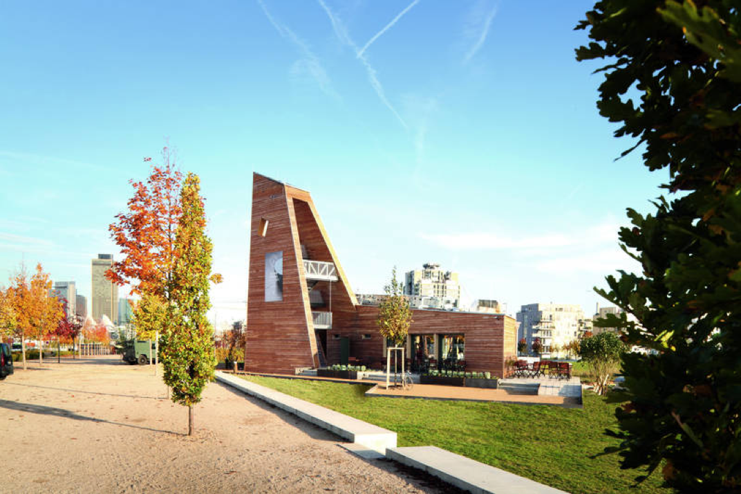Ein Gartenholzhaus mit Terrasse, eine offene Küche, ein Park mit Aussicht, Liebe zum Detail und eine gehörige Portion Leidenschaft - das sind die Grundzutaten der Laube Liebe Hoffnung im Frankfurter Europaviertel.