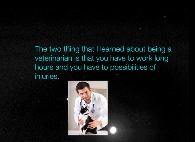 The two thing that I learned about being a veterinarian is that you have to work long hours and you have to possibilities of injuries.