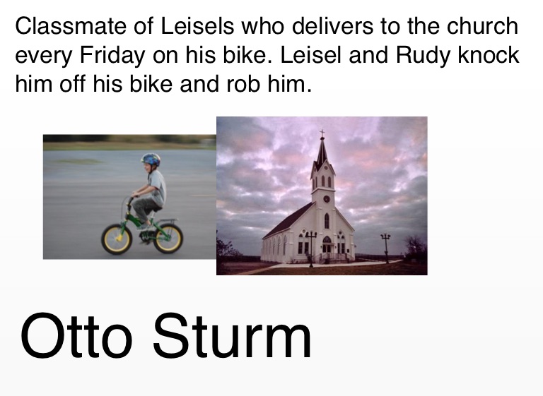 Classmate of Leisels who delivers to the church every Friday on his bike. Leisel and Rudy knock him off his bike and rob him.