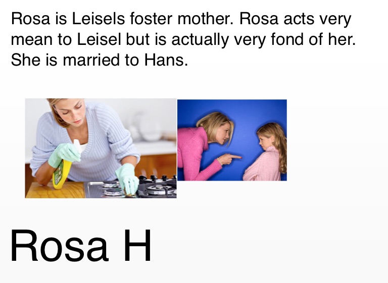 Rosa is Leisels foster mother. Rosa acts very mean to Leisel but is actually very fond of her. She is married to Hans.