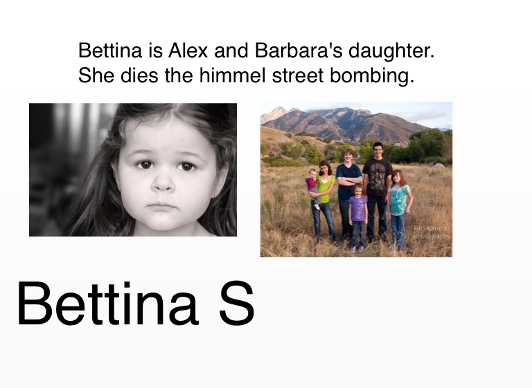 Bettina is Alex and Barbara's daughter. She dies the himmel street bombing.