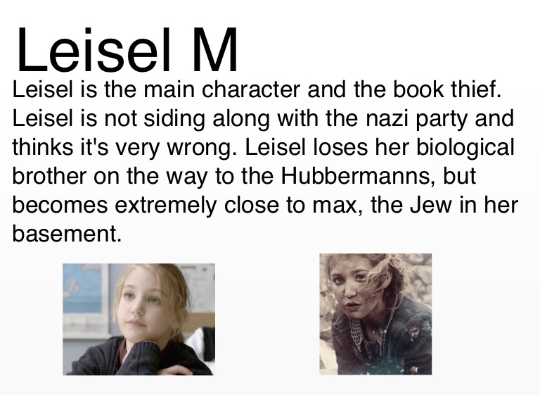 Leisel is the main character and the book thief. Leisel is not siding along with the nazi party and thinks it's very wrong. Leisel loses her biological brother on the way to the Hubbermanns, but becomes extremely close to max, the Jew in her basement.