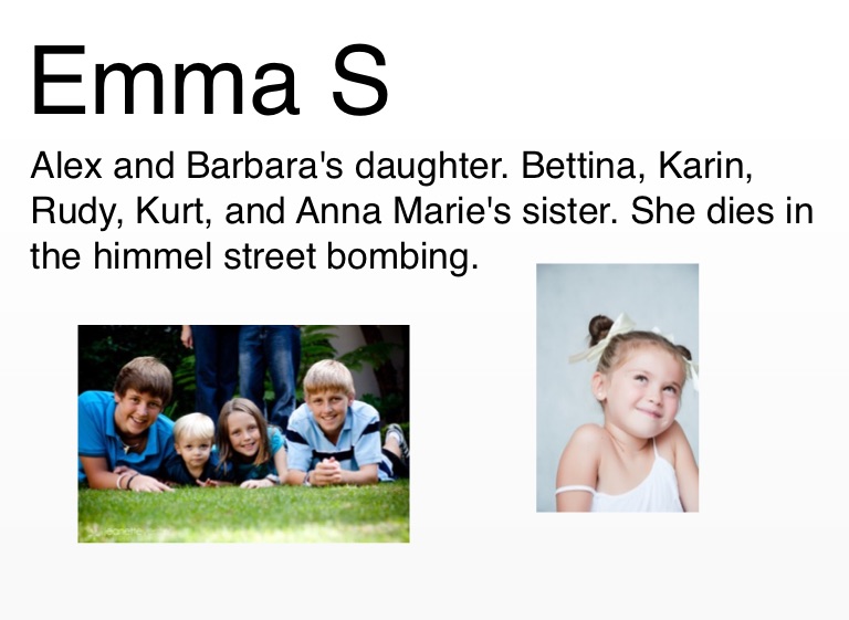 Alex and Barbara's daughter. Bettina, Karin, Rudy, Kurt, and Anna Marie's sister. She dies in the himmel street bombing.