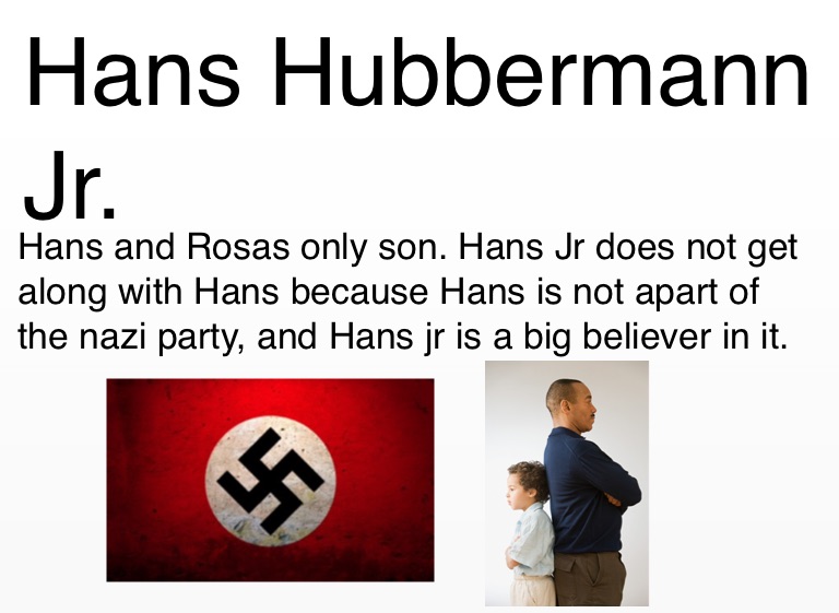 Hans and Rosas only son. Hans Jr does not get along with Hans because Hans is not apart of the nazi party, and Hans jr is a big believer in it.