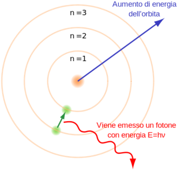 (Il modello atomico di Bhor a scala di energia quantizzata, spiega il comportamento dell'atomo di idrogeno che contiene un solo elettrone ma inadeguato per atomi più complessi contenenti più elettroni in grado di influenzarsi)