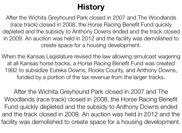 After the Wichita Greyhound Park closed in 2007 and The Woodlands (race track) closed in 2008, the Horse Racing Benefit Fund quickly depleted and the subsidy to Anthony Downs ended and the track closed in 2009. An auction was held in 2012 and the facility was demolished to create space for a housing development.