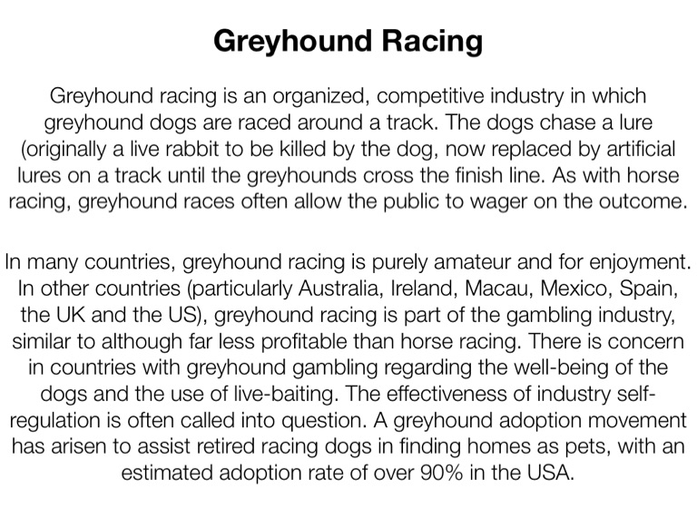 Greyhound racing is an organized, competitive industry in which greyhound dogs are raced around a track. The dogs chase a lure (originally a live rabbit to be killed by the dog, now replaced by artificial lures on a track until the greyhounds cross the finish line. As with horse racing, greyhound races often allow the public to wager on the outcome.