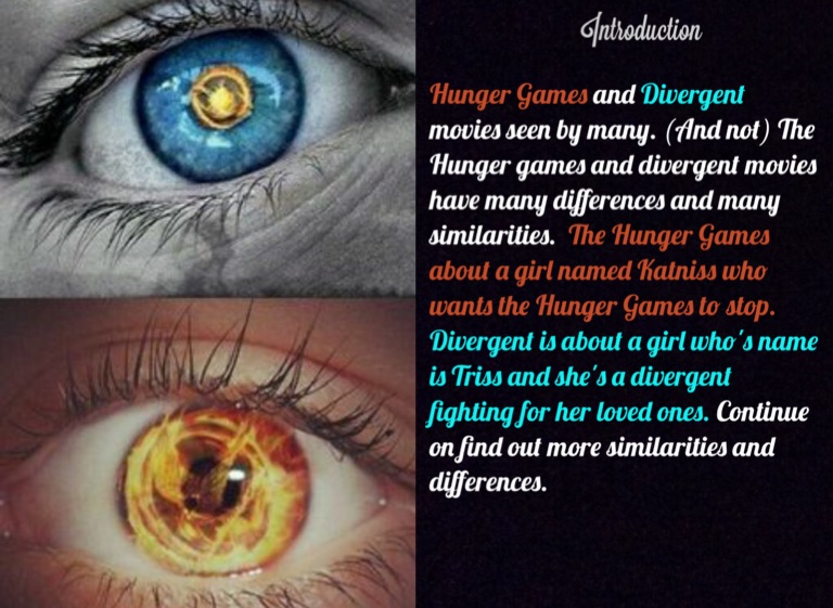 Hunger Games and Divergent movies seen by many. (And not) The Hunger games and divergent movies have many differences and many similarities. The Hunger Games about a girl named Katniss who wants the Hunger Games to stop. Divergent is about a girl who's name is Triss and she's a divergent fighting for her loved ones. Continue on find out more similarities and differences.