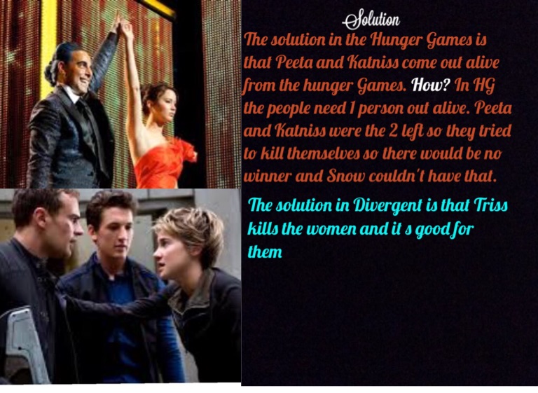 The solution in the Hunger Games is that Peeta and Katniss come out alive from the hunger Games. How? In HG the people need 1 person out alive. Peeta and Katniss were the 2 left so they tried to kill themselves so there would be no winner and Snow couldn't have that.