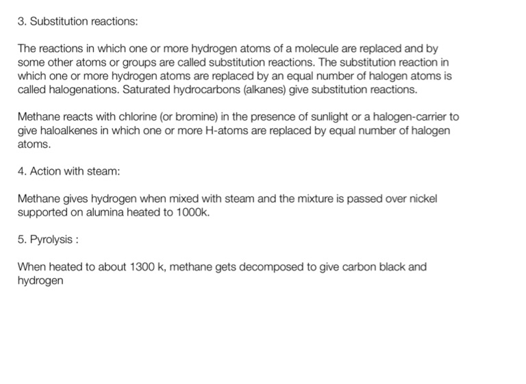 Methane reacts with chlorine (or bromine) in the presence of sunlight or a halogen-carrier to give haloalkenes in which one or more H-atoms are replaced by equal number of halogen atoms.