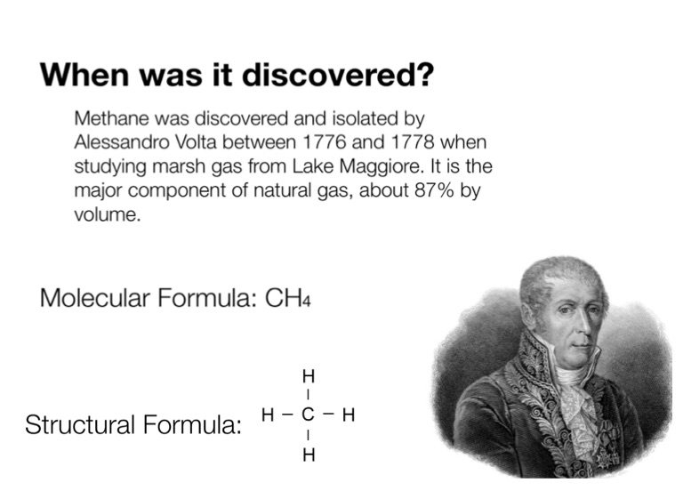 Methane was discovered and isolated by Alessandro Volta between 1776 and 1778 when studying marsh gas from Lake Maggiore. It is the major component of natural gas, about 87% by volume.