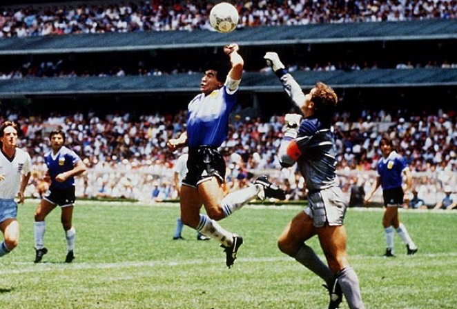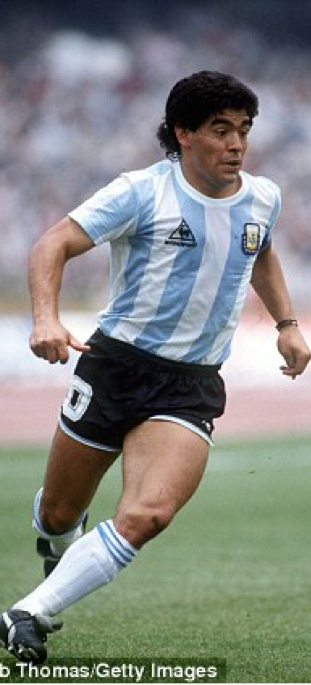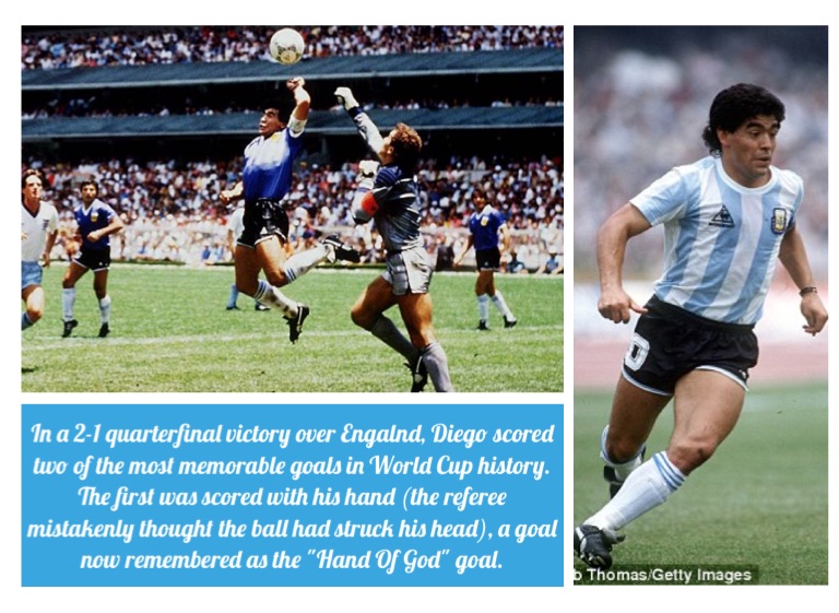 In a 2-1 quarterfinal victory over Engalnd, Diego scored two of the most memorable goals in World Cup history. The first was scored with his hand (the referee mistakenly thought the ball had struck his head), a goal now remembered as the "Hand Of God" goal.