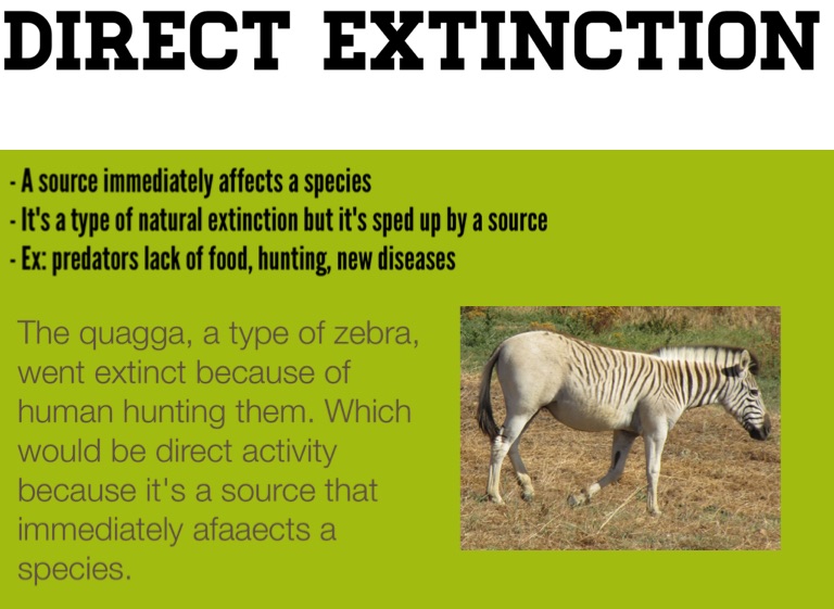 The quagga, a type of zebra, went extinct because of human hunting them. Which would be direct activity because it's a source that immediately afaaects a species.