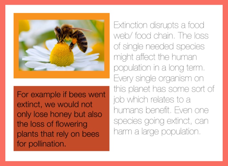 For example if bees went extinct, we would not only lose honey but also the loss of flowering plants that rely on bees for pollination.