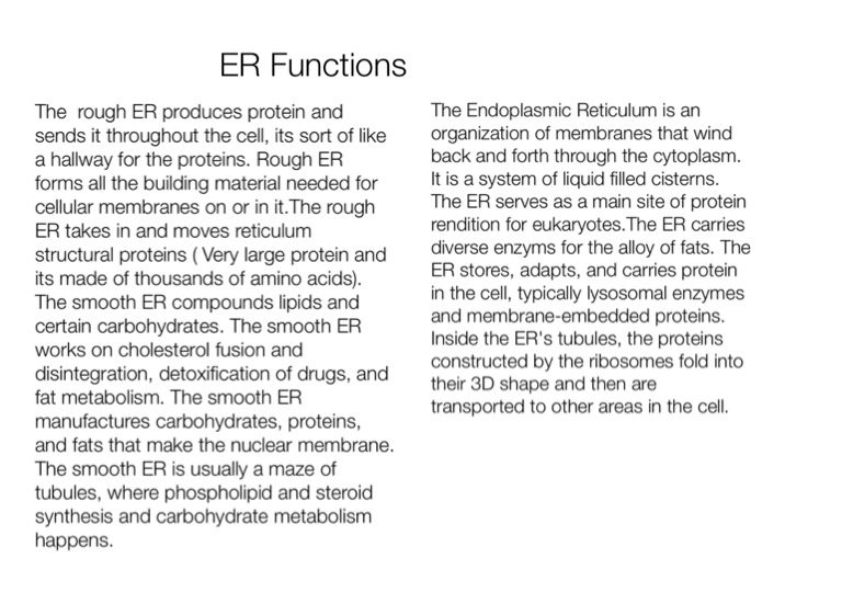 The rough ER produces protein and sends it throughout the cell, its sort of like a hallway for the proteins. Rough ER forms all the building material needed for cellular membranes on or in it.The rough ER takes in and moves reticulum structural proteins ( Very large protein and its made of thousands of amino acids). The smooth ER compounds lipids and certain carbohydrates. The smooth ER works on cholesterol fusion and disintegration, detoxification of drugs, and fat metabolism. The smooth ER manufactures carbohydrates, proteins, and fats that make the nuclear membrane. The smooth ER is usually a maze of tubules, where phospholipid and steroid synthesis and carbohydrate metabolism happens.