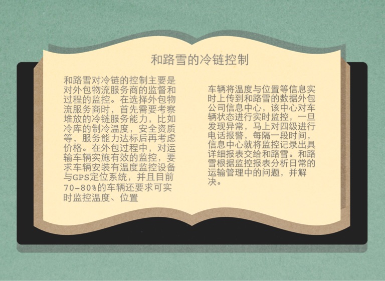 车辆将温度与位置等信息实时上传到和路雪的数据外包公司信息中心,该中心对车辆状态进行实时监控,一旦发现异常,马上对四级进行电话报警,每隔一段时间,信息中心就将监控记录出具详细报表交给和路雪。和路雪根据监控报表分析日常的运输管理中的问题,并解决。