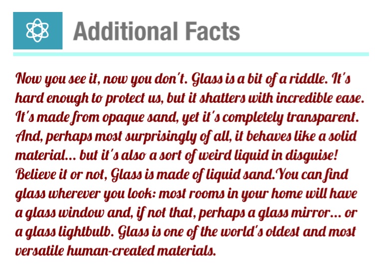 Now you see it, now you don't. Glass is a bit of a riddle. It's hard enough to protect us, but it shatters with incredible ease. It's made from opaque sand, yet it's completely transparent. And, perhaps most surprisingly of all, it behaves like a solid material... but it's also a sort of weird liquid in disguise! Believe it or not, Glass is made of liquid sand.You can find glass wherever you look: most rooms in your home will have a glass window and, if not that, perhaps a glass mirror... or a glass lightbulb. Glass is one of the world's oldest and most versatile human-created materials.