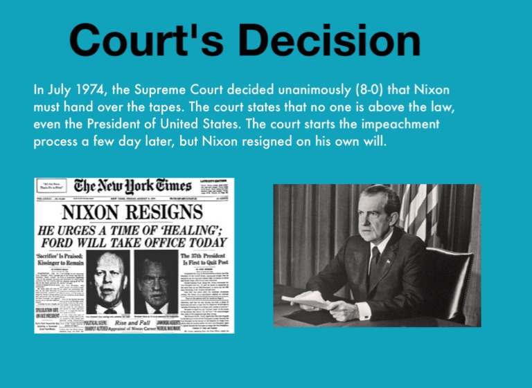 In July 1974, the Supreme Court decided unanimously (8-0) that Nixon must hand over the tapes. The court states that no one is above the law, even the President of United States. The court starts the impeachment process a few day later, but Nixon resigned on his own will.