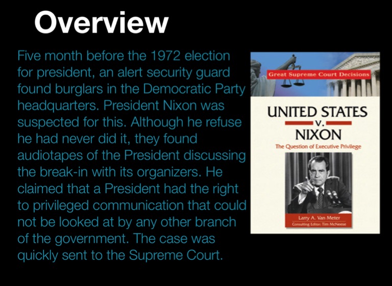 Five month before the 1972 election for president, an alert security guard found burglars in the Democratic Party headquarters. President Nixon was suspected for this. Although he refuse he had never did it, they found audiotapes of the President discussing the break-in with its organizers. He claimed that a President had the right to privileged communication that could not be looked at by any other branch of the government. The case was quickly sent to the Supreme Court.