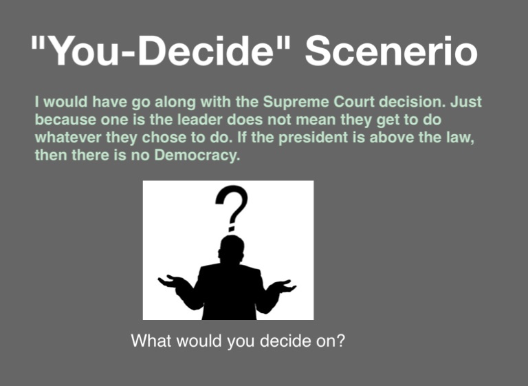 I would have go along with the Supreme Court decision. Just because one is the leader does not mean they get to do whatever they chose to do. If the president is above the law, then there is no Democracy.