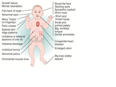 • Physical symptoms of this disorder are flat facial features, small head, short neck and slanted eyes.