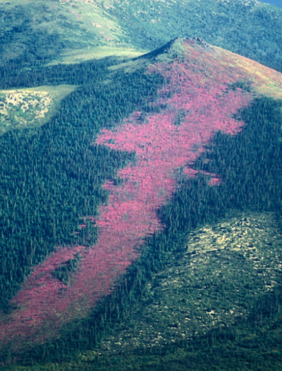 ⚫️ This wildflower is very unique because one plant can produce up to 80,000 seeds per year. Having so many seeds allows this flower to spread aggressively. In the photo, you can see that thousands of Fireweeds are growing up the mountain range.
