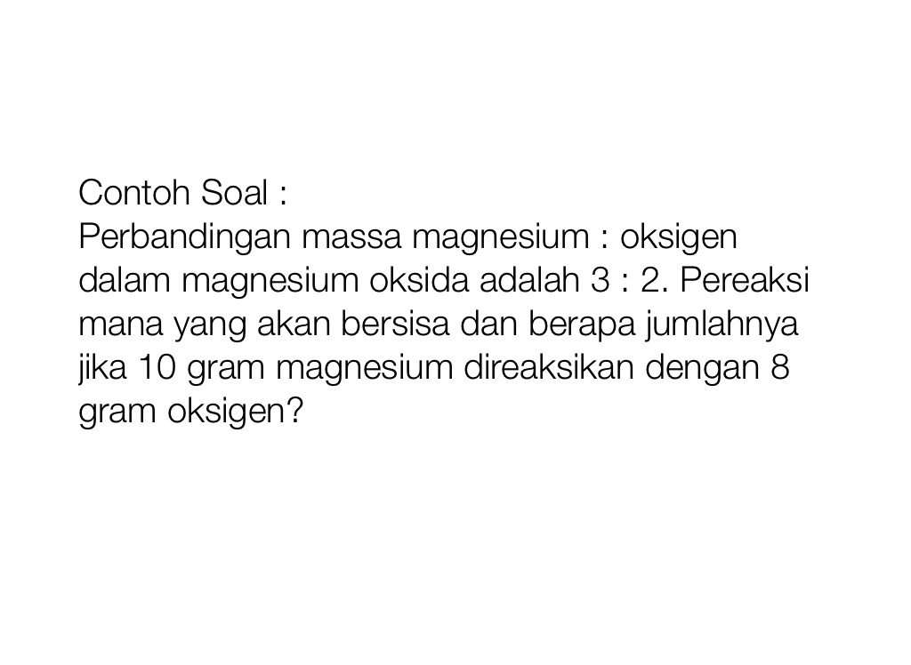 Perbandingan massa magnesium : oksigen dalam magnesium oksida adalah 3 : 2. Pereaksi mana yang akan bersisa dan berapa jumlahnya jika 10 gram magnesium direaksikan dengan 8 gram oksigen?
