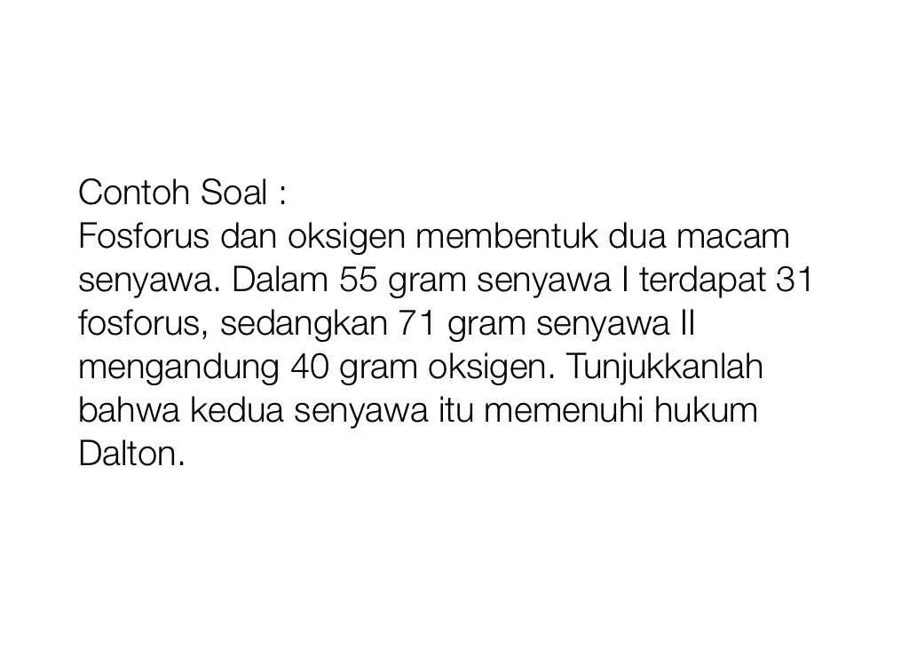 Fosforus dan oksigen membentuk dua macam senyawa. Dalam 55 gram senyawa I terdapat 31 fosforus, sedangkan 71 gram senyawa II mengandung 40 gram oksigen. Tunjukkanlah bahwa kedua senyawa itu memenuhi hukum Dalton.
