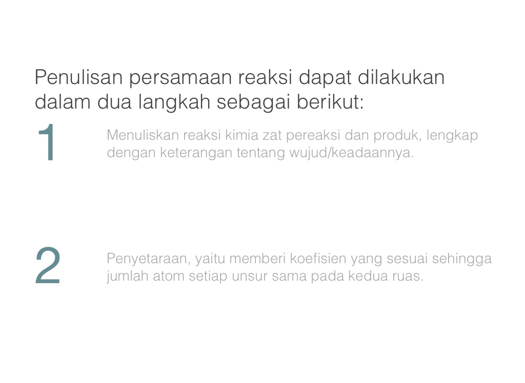Penyetaraan, yaitu memberi koefisien yang sesuai sehingga jumlah atom setiap unsur sama pada kedua ruas.
