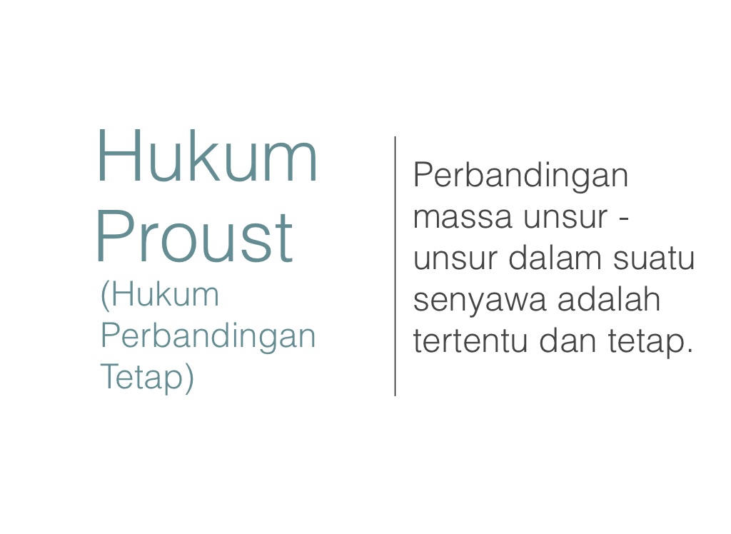 Perbandingan massa unsur - unsur dalam suatu senyawa adalah tertentu dan tetap.