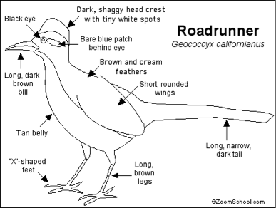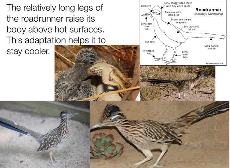 The relatively long legs of the roadrunner raise its body above hot surfaces. This adaptation helps it to stay cooler.