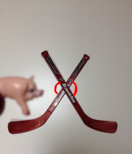 Jeesh points out that his hockey sticks have vertical angles. This is shown by the pair of opposite angles that are formed from two intersecting lines.