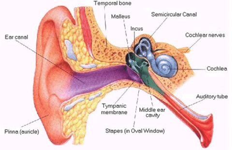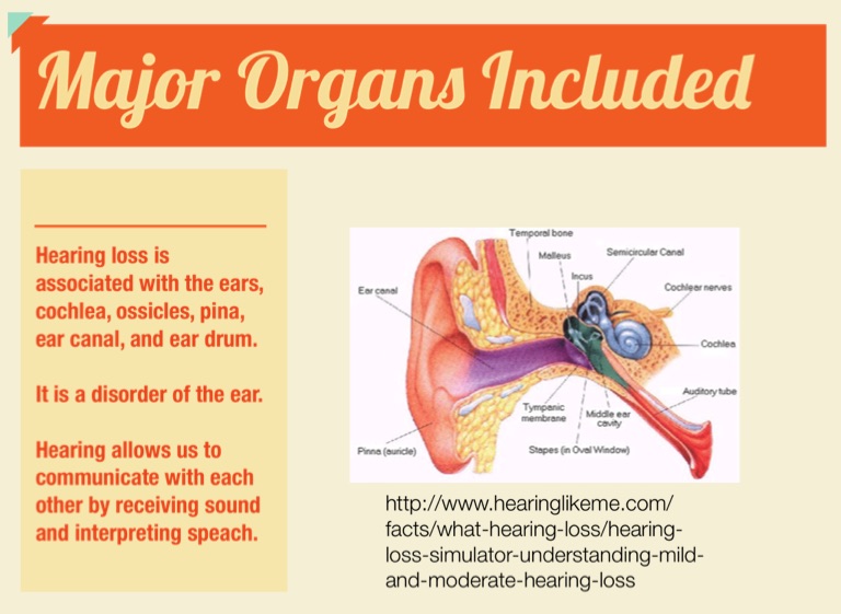 Hearing loss is associated with the ears, cochlea, ossicles, pina, ear canal, and ear drum.