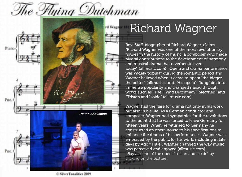 Rovi Staff, biographer of Richard Wagner, claims “Richard Wagner was one of the most revolutionary figures in the history of music, a composer who made pivotal contributions to the development of harmony and musical drama that reverberate even today” (allmusic.com). Opera and drama performance was widely popular during the romantic period and Wagner believed when it came to opera “the bigger, the better” (allmusic.com). His opera’s flung him into immense popularity and changed music through works such as “The Flying Dutchman”, “Siegfried” and “Tristan and Isolde” (all music.com).