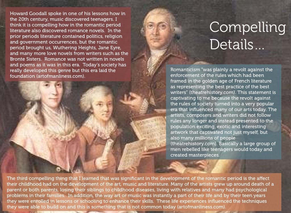 The third compelling thing that I learned that was significant in the development of the romantic period is the affect their childhood had on the development of the art, music and literature. Many of the artists grew up around death of a parent or both parents, losing their siblings to childhood diseases, living with relatives and many had psychological problems in their families. In addition, the way art or music was instantly a part of their life and by their teen years they were enrolled in lessons or schooling to enhance their skills. These life experiences influenced the techniques they were able to build on and this is something that is not common today (artofmanliness.com).