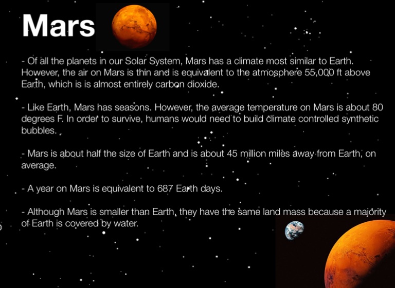 - Of all the planets in our Solar System, Mars has a climate most similar to Earth. However, the air on Mars is thin and is equivalent to the atmosphere 55,000 ft above Earth, which is is almost entirely carbon dioxide.