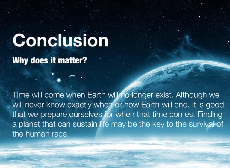 Time will come when Earth will no longer exist. Although we will never know exactly when or how Earth will end, it is good that we prepare ourselves for when that time comes. Finding a planet that can sustain life may be the key to the survival of the human race.