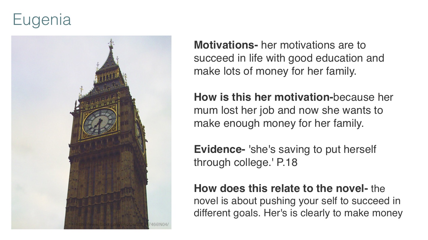 How does this relate to the novel- the novel is about pushing your self to succeed in different goals. Her's is clearly to make money and go to college.