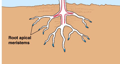 In plants mitosis occurs in the meristem. Which is at the tip of the roots.