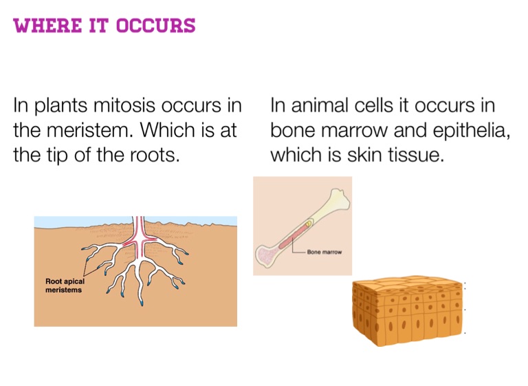 In animal cells it occurs in bone marrow and epithelia, which is skin tissue.