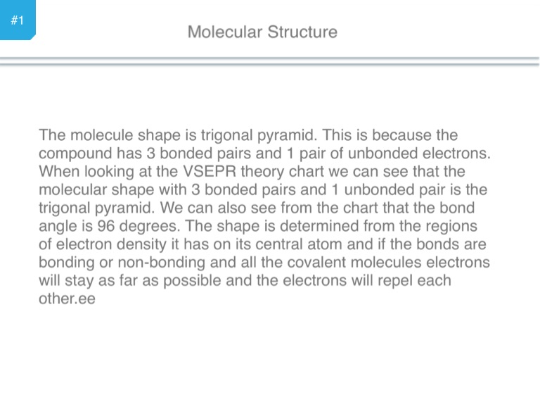 The molecule shape is trigonal pyramid. This is because the compound has 3 bonded pairs and 1 pair of unbonded electrons. When looking at the VSEPR theory chart we can see that the molecular shape with 3 bonded pairs and 1 unbonded pair is the trigonal pyramid. We can also see from the chart that the bond angle is 96 degrees. The shape is determined from the regions of electron density it has on its central atom and if the bonds are bonding or non-bonding and all the covalent molecules electrons will stay as far as possible and the electrons will repel each other.ee