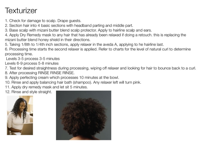 5. Taking 1/8th to 1/4th inch sections, apply relaxer in the aveda A, applying to he hairline last.