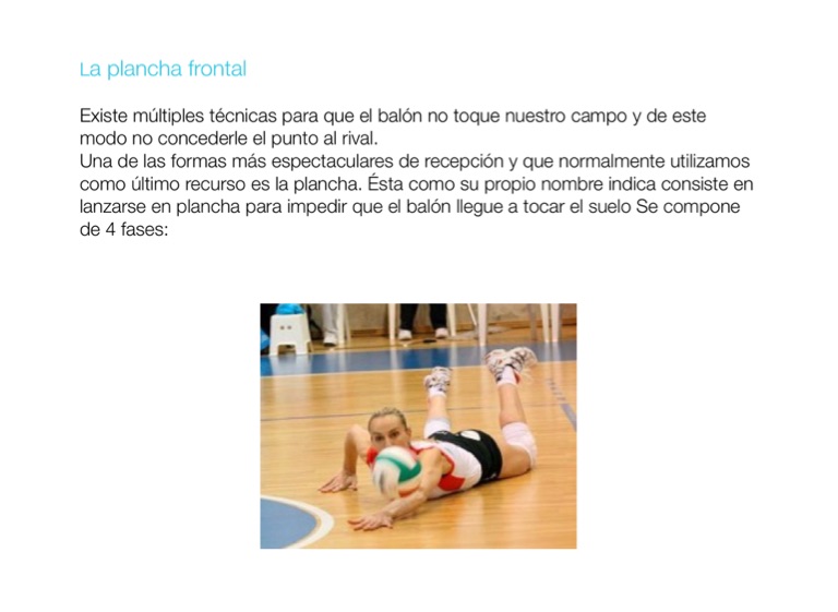 Una de las formas más espectaculares de recepción y que normalmente utilizamos como último recurso es la plancha. Ésta como su propio nombre indica consiste en lanzarse en plancha para impedir que el balón llegue a tocar el suelo Se compone de 4 fases: