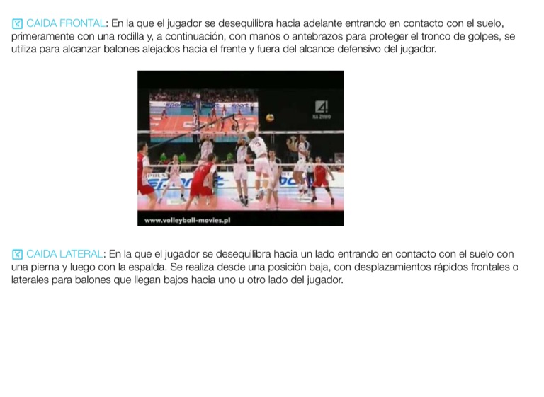 CAIDA LATERAL: En la que el jugador se desequilibra hacia un lado entrando en contacto con el suelo con una pierna y luego con la espalda. Se realiza desde una posición baja, con desplazamientos rápidos frontales o laterales para balones que llegan bajos hacia uno u otro lado del jugador.