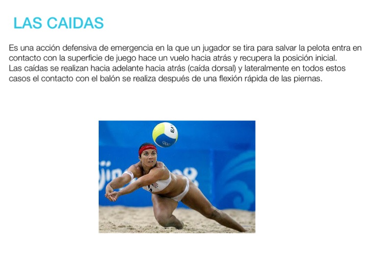 Las caídas se realizan hacia adelante hacia atrás (caída dorsal) y lateralmente en todos estos casos el contacto con el balón se realiza después de una flexión rápida de las piernas.