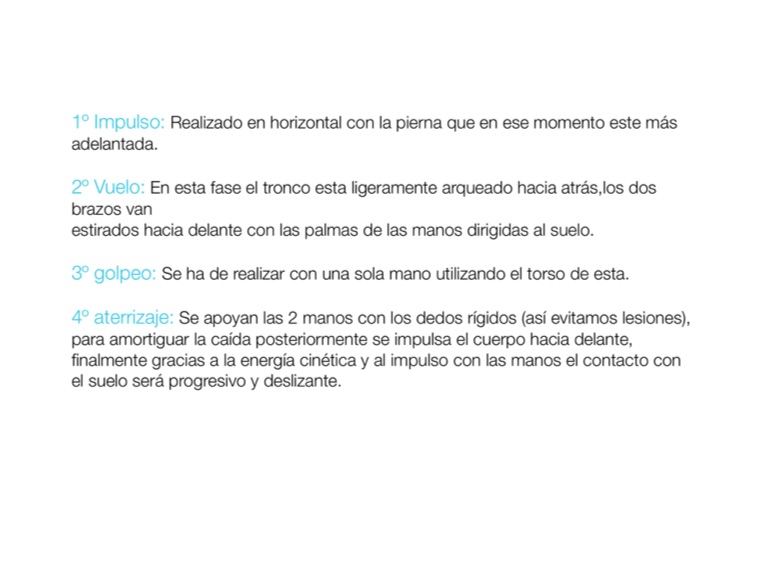 4º aterrizaje: Se apoyan las 2 manos con los dedos rígidos (así evitamos lesiones), para amortiguar la caída posteriormente se impulsa el cuerpo hacia delante, finalmente gracias a la energía cinética y al impulso con las manos el contacto con el suelo será progresivo y deslizante.