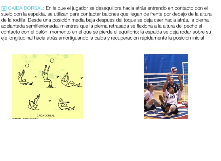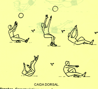 CAIDA DORSAL: En la que el jugador se desequilibra hacia atrás entrando en contacto con el suelo con la espalda, se utilizan para contactar balones que llegan de frente por debajo de la altura de la rodilla. Desde una posición media baja después del toque se deja caer hacia atrás, la pierna adelantada semiflexionada, mientras que la pierna retrasada se flexiona a la altura del pecho al contacto con el balón, momento en el que se pierde el equilibrio; la espalda se deja rodar sobre su eje longitudinal hacia atrás amortiguando la caída y recuperación rápidamente la posición inicial