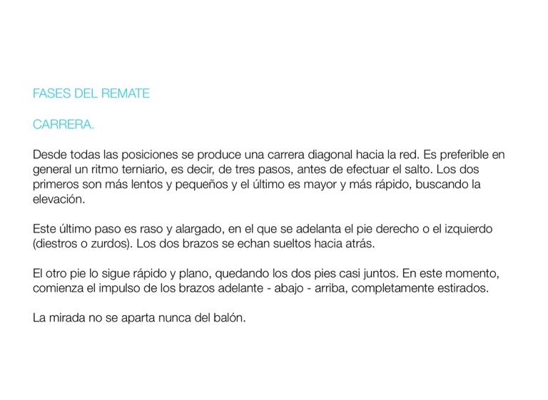 Desde todas las posiciones se produce una carrera diagonal hacia la red. Es preferible en general un ritmo terniario, es decir, de tres pasos, antes de efectuar el salto. Los dos primeros son más lentos y pequeños y el último es mayor y más rápido, buscando la elevación.